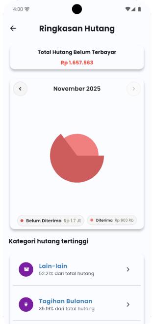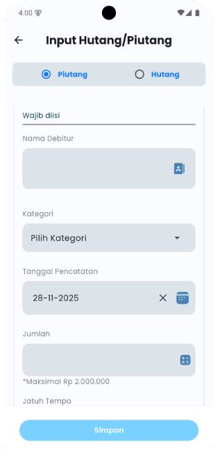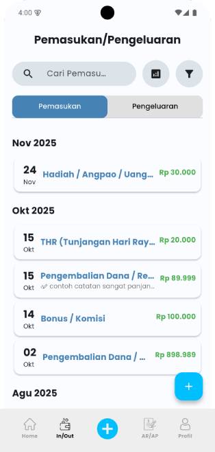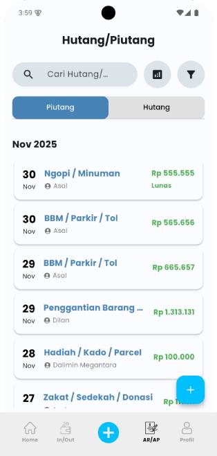 Catat pemasukan, pengeluaran, hutang, dan piutang kamu dalam satu aplikasi.